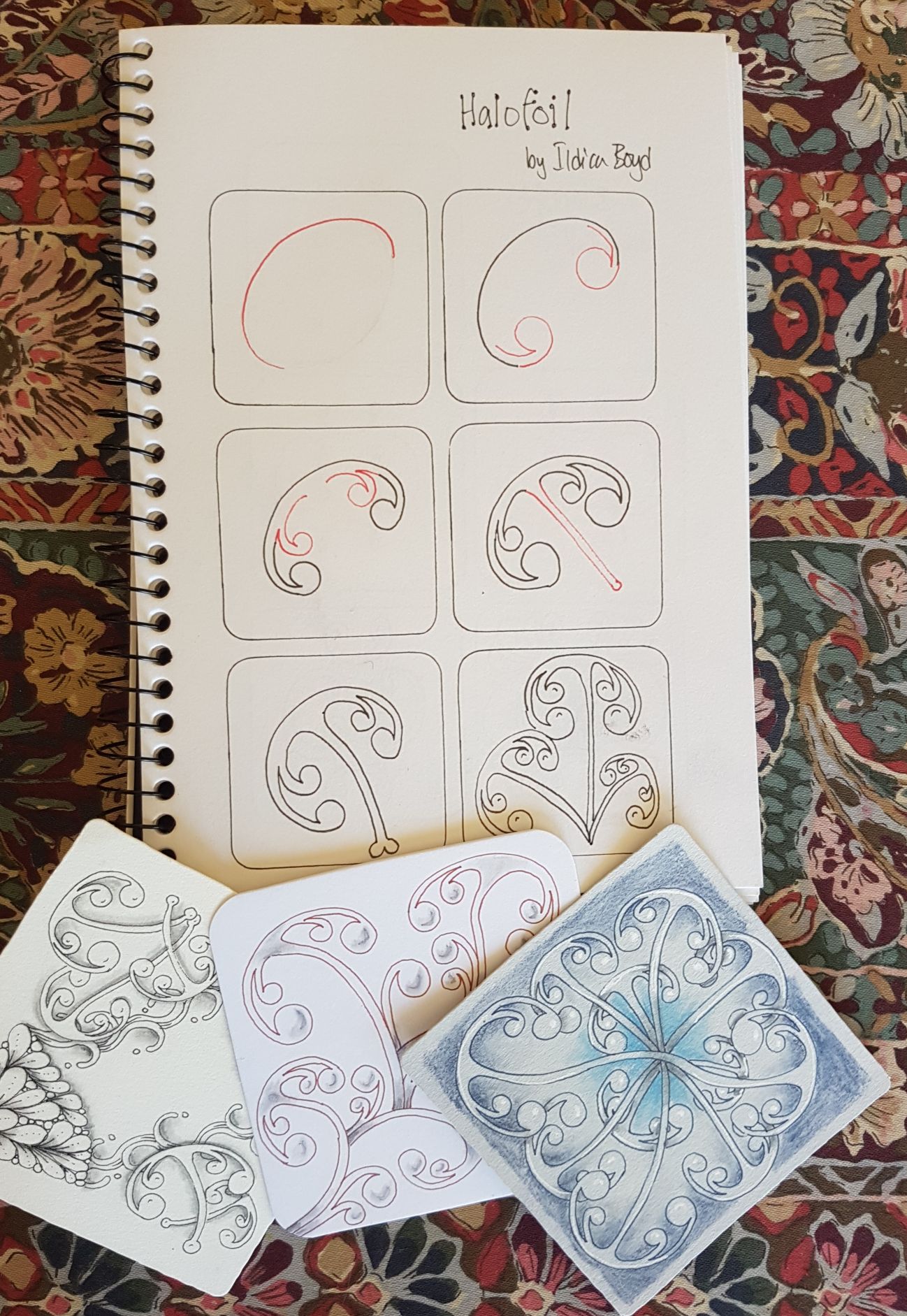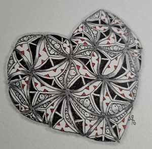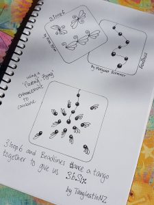 This tangle will be recognised by many in New Zealand as the very recognisable Māori pattern representing the Hammerhead shark – mangōpare – symbolising strength, leadership, agility, tenacity, unrelenting determination, and courage. (Our weather service here has a pair of them in their logo – I think it aptly describes our weather sometimes!) I have called the tangle Halofoil, from the Cephalofoil ( the name of the shape of the head of a hammerhead). If you are a Mooka fan, you will probably enjoy drawing this tangle, whether in a growth, blossom or individual element way. enjoy playing with it.