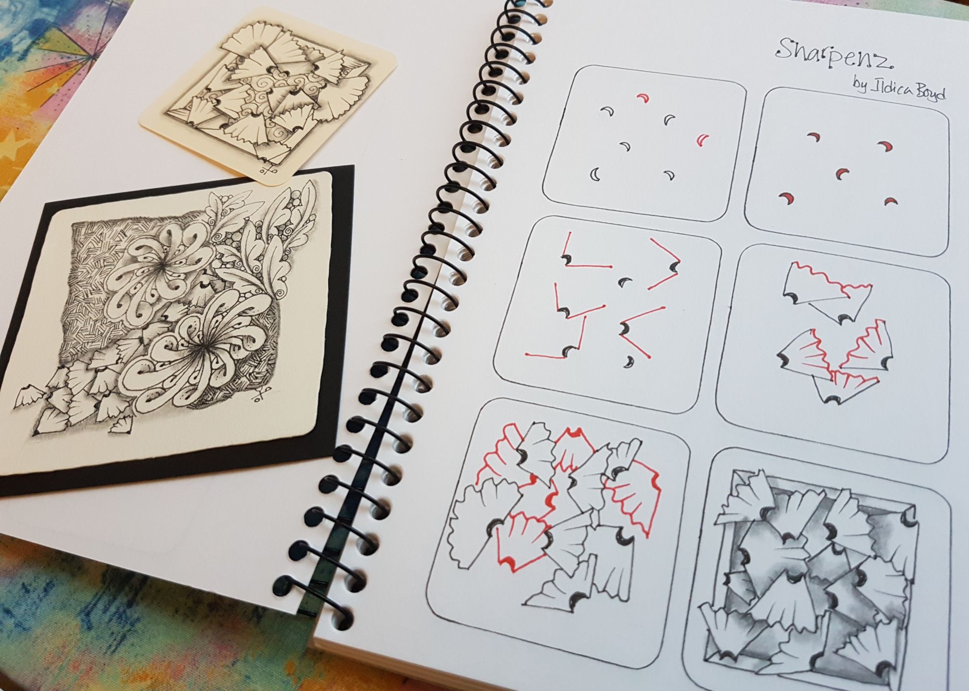 SharpeNZ came about because as a tangler we spot patterns everywhere! When I treated my coloured pencils to being sharpened all at the same time prior to a lesson, and then within the little tub of sharpened rubbish I saw a tangle! This tangle works well whether it is overflowing the section edge, or as a background tangle tucked in behind others and with some shavings floating away.