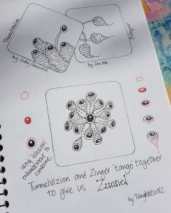 Zunnel – Another tango tangle this one has it’s roots in Zinger (ZenHQ) and TunnelVizon by Jody Genovese. I always love a blossom tangle and this is a great combo one with my Zunnel creatures heading out to explore the universe. I originally made this up as like mini floating TunnelVizion creatures floating off from a TunnelVizon base, but I like the drama blossom to set this guys off!