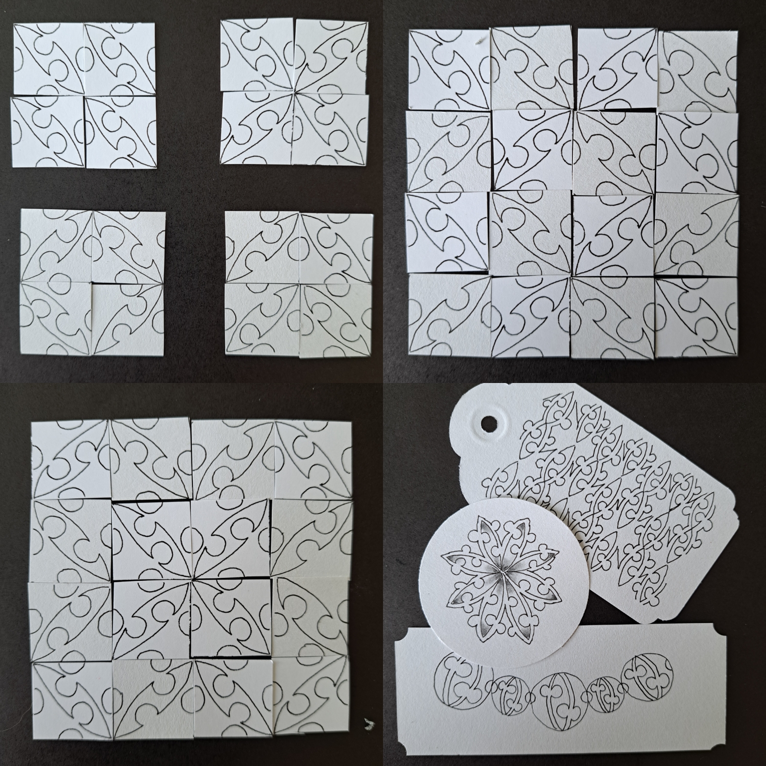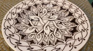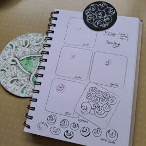 For a while I had been looking for a background orb tangle, rather than just falling back to the Tipple, and I wondered if there was a sorta pearl like one I could draw. Having sat on the idea for several months, a beautiful pattern on a armoured glove caught my eye, and I was trying to work out how to easily deconstruct it. Turned out is was an easy as a smile. So when you are drawing this tangle it is four strokes, a smile, a smile, a smile and then a grin. Four ‘C’ curved strokes of various sizes and curvatures so bring this orb shaped tangle into life, all in one pen stroke, smiling back and forth on the page. I tried it with my local group, and we were all reciting “smile, smile, smile and grin as we drew it. Hence three Smiles and Grin. 3SG