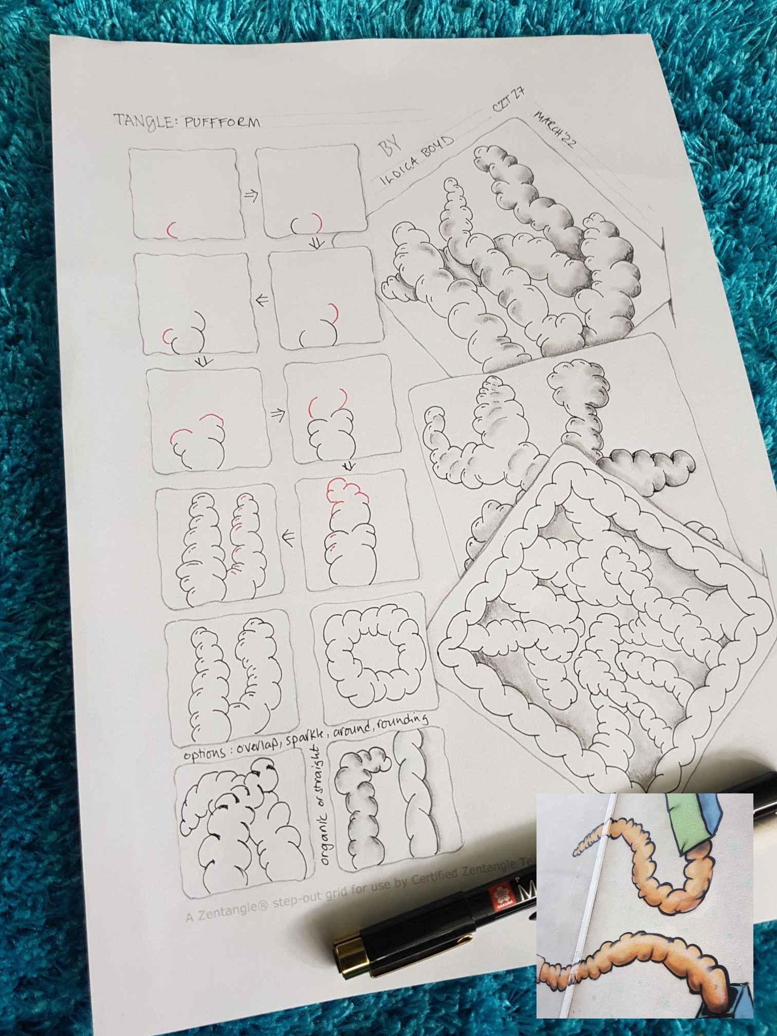 A really simple tangle just involving some weird and wonderful ‘C ‘strokes. Unbalanced, random angles, sizes and depths your ‘c’ curves build in a tower to produce this tangle Puffform based on some wall art, I saw on a wall in one of downtown Wellington’s pedestrian alleyways. Whether they are worms, intestines or puff adders who knows!