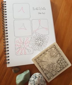 Tripiko came about from my love of tangos – taking two tangles and mixing them to dance together. This one combines my own Pikoruairi and Trinity by Stephanie Kiefhaber. I used the elemental strokes of the two different tangles to give a blossom tangle which grows in three layers. It’s ripe for adding various endings to the twists to suit your style and embellishing with other tangles behind it.