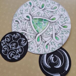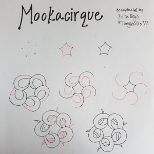 This tangle is named after Maui’s Hook. One of our Māori land creation stories is that Maui’s canoe is the South Island of New Zealand, and he used a hook (made from the jaw bone of his grandmother Murirangawhenua) and fished up the North island. I was playing with the hook idea being laid in a circle format and came up with this new tangle. It took me a while to work out the best way to draw this tangle, and the use of the second set of dots is helpful, because once you have built the main centre part, it then allows you to embellish your hooks as you wish, with various different exotic enhancements, you can find ideas in my enhancement guide. Enjoy circling your hooks with Mookacirque!