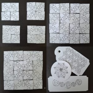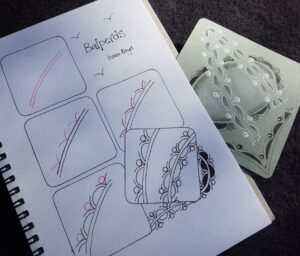 This lineal tangle came to me when I was experimenting with Perfs for my Extend your Enhancement book. Playing along with ways to extend the enhancement technique of adding ‘Perfs’ I had already lined them up, floated them, overlapped them, I decided to balance them – but on what? Ah ha I thought, the little birds. This wee curved line, is a stroke I use in my teaching, (particularly when I am teaching the tangle Gneiss). It’s a great stroke to ask people to draw a far away bird, flying in the sky, then I took this little bird and balanced a Perf on it. and here then is Balperds. BALancingPErfs&biRDS.