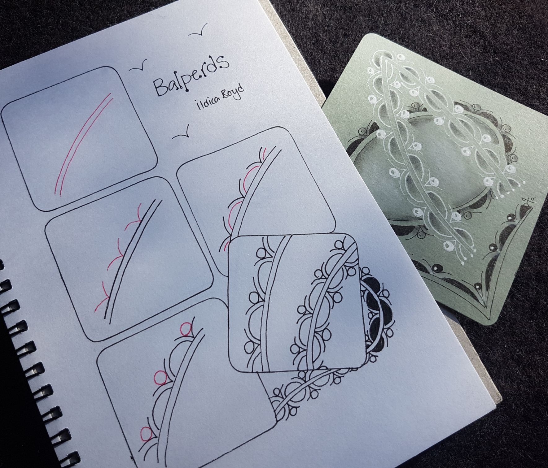 This page lists various tangles of my own. Please enjoy following along with these step-out instructions to re-create any of the tangles found on this page. However, all images featured below remain the intellectual property of Ildica Boyd. I ask that the images below not be copied or reproduced, but of course feel free to draw your own step outs, and include the tangles in your work 🙂