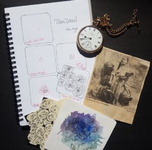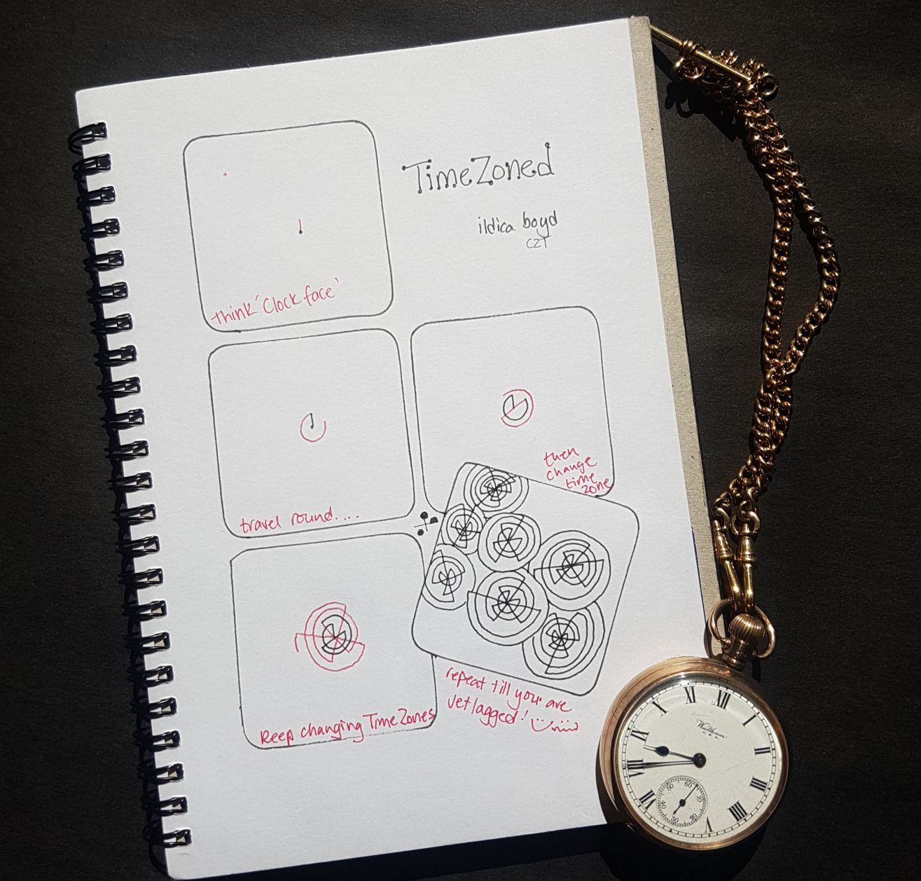 Living at the end of the line in terms of flight destinations can involve long journeys home. (Well maybe not quite the end of the line, from Christchurch we can reach Antarctica.) However heading overseas in 2022, on my return journey, my planned 28 hrs journey home, morphed into a 64 hrs epic marathon of flights! In Hongkong airport – one of the multi-stop journey pauses, I and other fellow travellers were all completed confused looking at the departure board; we could see which gate we were supposed go to for the next flight and when we were to be there – but we had now idea what time zone we were in now, or what time it was! So my confused and garbled headspace inspired this tangle ‘TimeZoned‘.