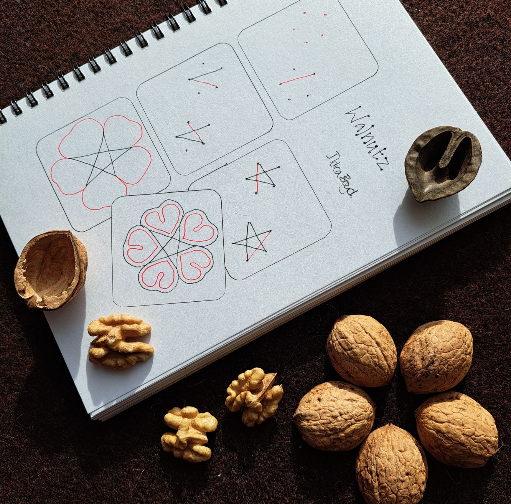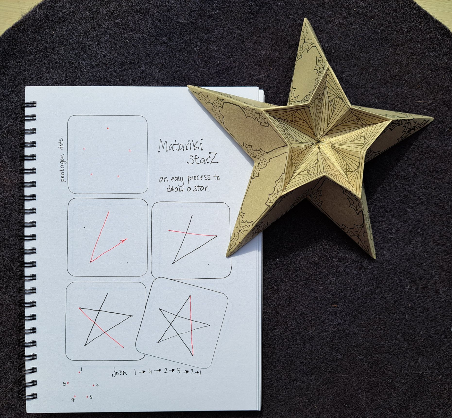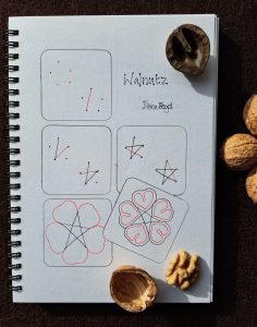 It’s always fun to spot a tangle in an unexpected place, and collecting walnuts under a tree, and one nut shell that I picked up ended up being a shell only, but it wasn’t that another creature got to the nut first, it ended up being a shell from last year that had fallen from the tree and had never matured into a nut. But what I saw was a beautiful pattern, with gorgeous shadows. So after I extracted some delicious nuts from other shells, I found I was drawn to the shell that wasn’t a nut. Hmmm, being only a ‘wasn’t’ wasn’t what it deserved, it deserved to be a tangle! So enjoy adding Walnutz to your tangling – great for a blossom starter or chained or overlapped. (Note: the starter for this tangle is drawing a five pointed star free hand – so if you are not aware of drawing this in any easy fashion – see below for Matariki Star, as the way to draw it.