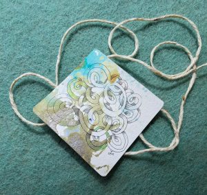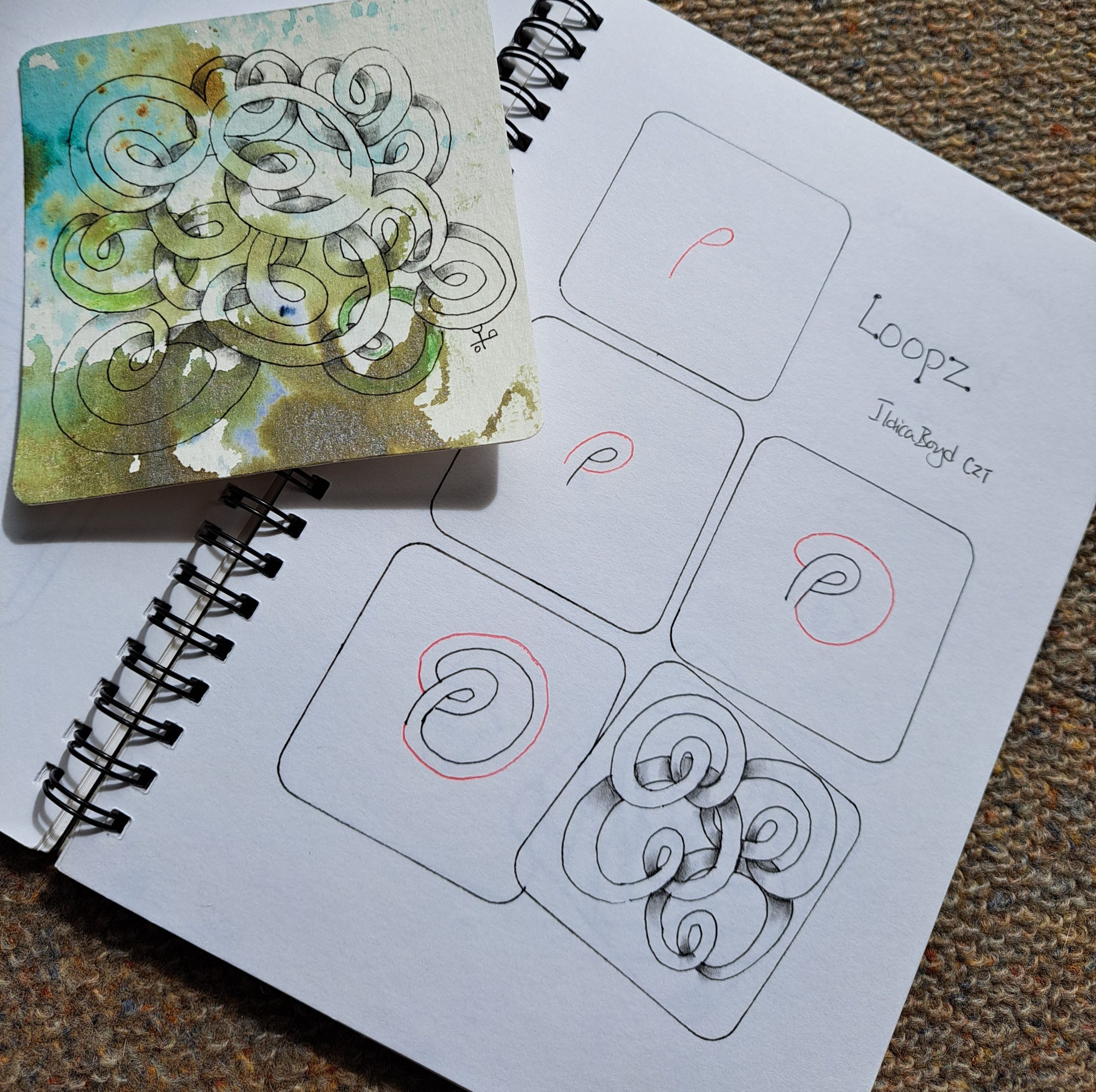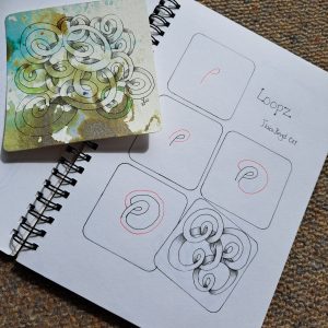 With my passion for weaving (my first love) and creating patterns in fabric with the endless combinations of over and under with yarn in the warp and weft directions, the endless supply of weaving patterns is very creative. I always joke with my very computer literate partner that I use the earliest computer, it is simple binary of course! But for Loopz, I hadn’t even got to being influenced by what I saw on the loom. It wasn’t from the fabric, but the simple pattern/ tangle was from the yarn itself. So here is Loopz. Although the weaver in me might question where the yarn ends, these lovely little loops of yarn make for a curvy maze type tangle, that can have fun as a monotangle, and so many other ways – so I’d love to see what you do with it.