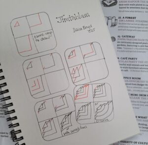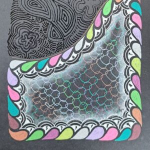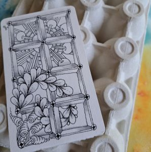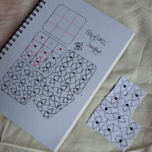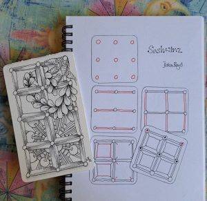 Sashwinz came out of a need to find a tangle suitable to host my Spill Out technique lesson which I taught at the Yintangle Retreat in October 2023, so thinking of the best ways to help teach the technique I came up with the idea of a window, so this tangle is based on an old fashioned sash window. Although the tangle can now be found within my downloadable Transitions and Spill out lesson, I also found the pattern/tangle not long after in a very unlikely place!