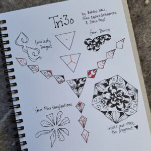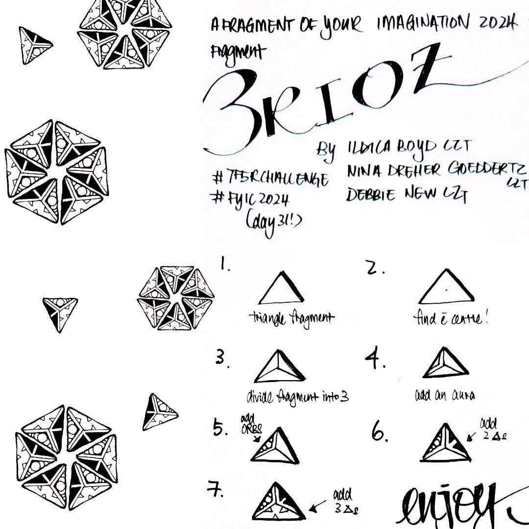 The final fragment from 7F5R’s A Fragment of Your Imagination 2025 prompt list, Debbie New CZT, Nina Dreher-Goeddertz CZT and myself, co-designed this cute triangle fragment to celebrate the three of us working together on this prompt list once again. Debbie choose her lovely tangle Tangent as her base, Nina loved the drama Bunzo and I threw in a couple of tangleations of flux with a drama fill. Do have fun rotating this fragment for mega patterns and beyond.
