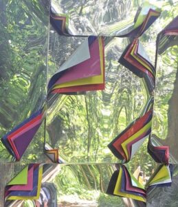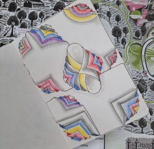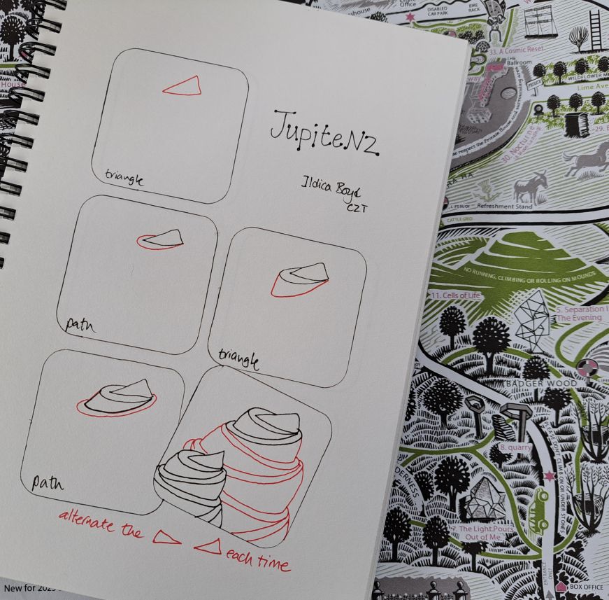 The final tangle influenced by Jupiter Artland, is this one from ‘A Forest’. Jim Lambie has covered the steading wall in chrome panels which reflect the forest beside the building, with the layers revealing colours and the reflections changing its look with every season. The first time I taught this, some of my learners weren’t finding it particularly easy, so just as we teachers teach, we also learn from our students, so I went back and had a further play with the feedback and ideas I received, could I make the step outs easier to follow? In the end just as we all learn differently, and like different tangles, I found three different ways to draw it (maybe you can find a fourth!) So have a look at which way speaks to you, and draw it your way. It was also fun to play with different tab shapes and curve lines.