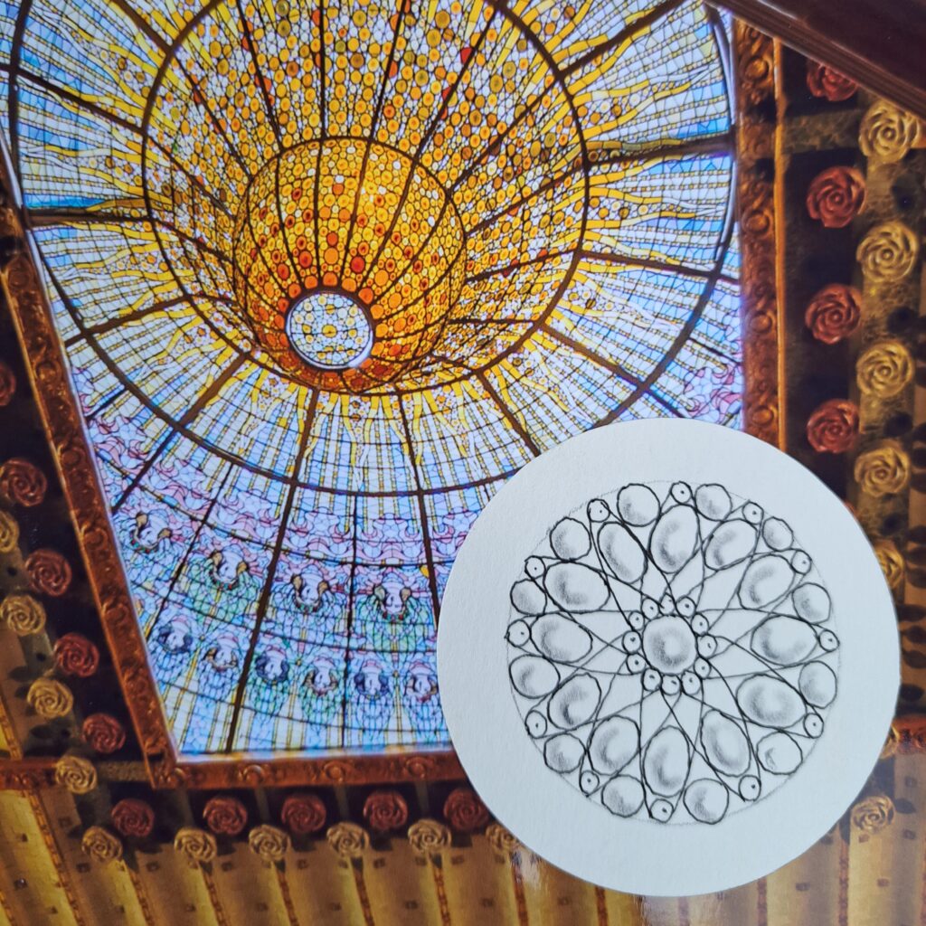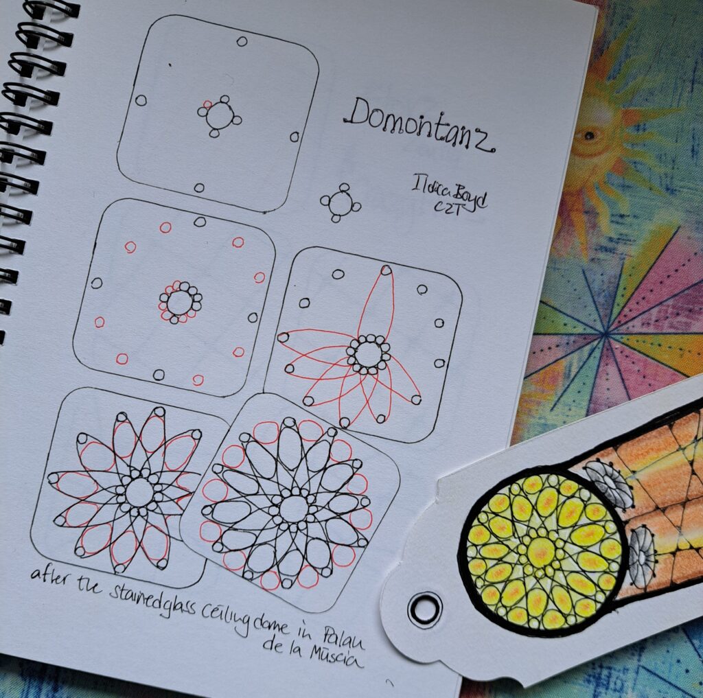 This tangle appeared when I was designing a lesson plan based on the stained glass ceiling dome of the Palau de la Música Catalana, a stunning concert hall in Barcelona designed by Lluis Domènech i Montaner. A combination of small orbs laid out like a clock face, with some lines, added larger orbs and the rounding technique of space you use in the tangle Nzeppell, it’s a blossoming tangle that can come to life.