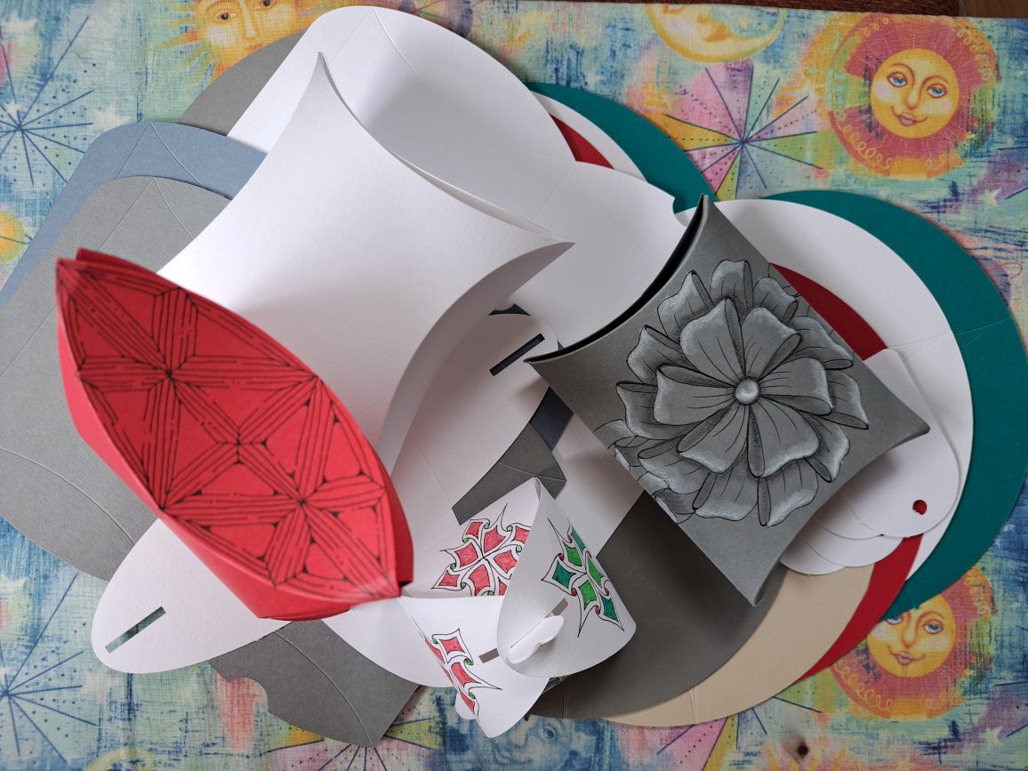 Do you like to get creative with your tangling? A set of nine blank creative tiles, which you can add your tangles on the colourful paper and turn into your own beautiful tangled gift boxes. There are five large square pillows, 3 regular box pillows, and a small petal box along with four blank gift tags.